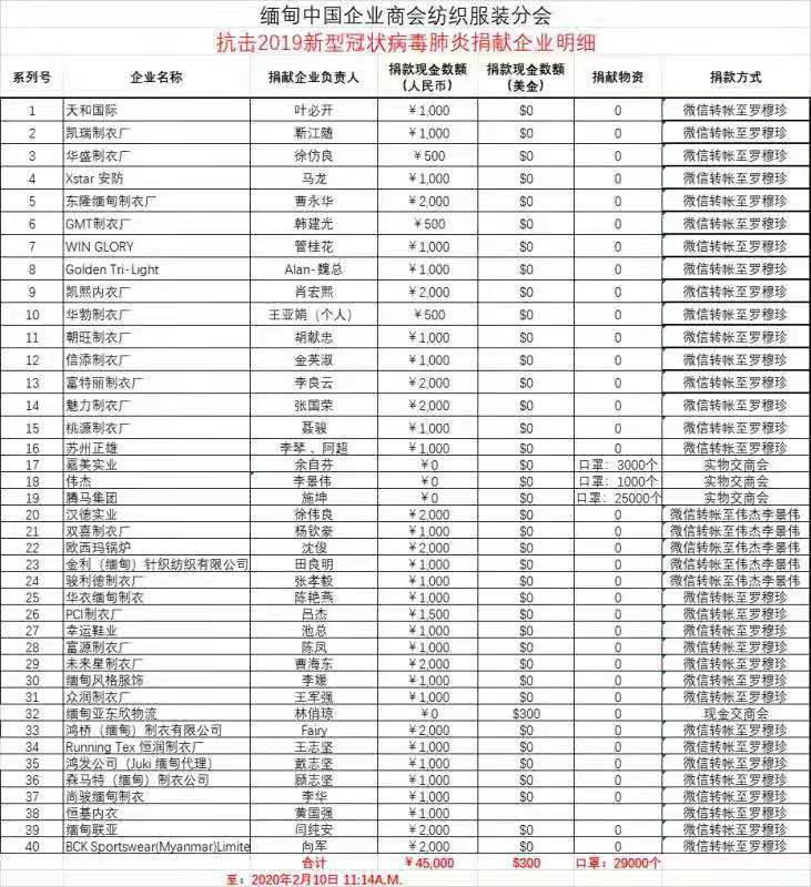 緬甸中國(guó)商會(huì)在1月27日即面向在緬中資企業(yè)發(fā)出了“緬甸中國(guó)企業(yè)商會(huì)支援祖國(guó),抗擊新型冠狀病毒感染肺炎倡議書”,隨后成立了疫情防控和捐贈(zèng)協(xié)調(diào)工作小組,設(shè)定專人分工負(fù)責(zé)捐贈(zèng)事宜的協(xié)調(diào)和物資信息登記等工作。作為緬甸中國(guó)商會(huì)的主要分支機(jī)構(gòu),緬甸中國(guó)商會(huì)紡織服裝分會(huì)積極動(dòng)員會(huì)員企業(yè)捐款捐物。截至2月10日,緬甸中國(guó)企業(yè)商會(huì)紡織服裝分會(huì)共收到在緬中資紡織服裝企業(yè)的捐款將近人民幣5萬(wàn)元,以及捐贈(zèng)口罩29000個(gè)。