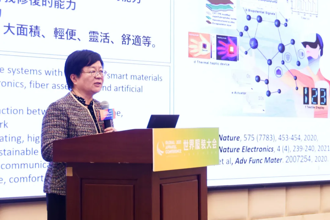 香港理工大學(xué)智能穿戴系統(tǒng)研究院教授陶肖明作《智能服飾的應(yīng)用現(xiàn)狀和展望》報告。陶肖明指出,從紡織服裝全生命周期要求來看,功能材料需要向綠色安全化方向發(fā)展,例如加強(qiáng)研發(fā)生物基和可降解纖維材料,通過物理或機(jī)械方法實現(xiàn)無水或少水印染等。當(dāng)前服飾應(yīng)用范圍已經(jīng)從傳統(tǒng)時尚擴(kuò)大到健康、醫(yī)療、機(jī)器人、元宇宙等各方面,未來服裝供應(yīng)鏈將向著設(shè)計智能化、生產(chǎn)自動化、評測數(shù)字化的方向發(fā)展。另外她強(qiáng)調(diào),智能可穿戴設(shè)備實現(xiàn)的關(guān)鍵因素是先進(jìn)功能面料的研發(fā)與應(yīng)用,紡織與微電子兩大產(chǎn)業(yè)要加強(qiáng)合作,達(dá)到高性能、高可靠性、低成本、可量產(chǎn)化的目標(biāo),實現(xiàn)功能器件與紡織結(jié)構(gòu)異質(zhì)異構(gòu)集成化發(fā)展。