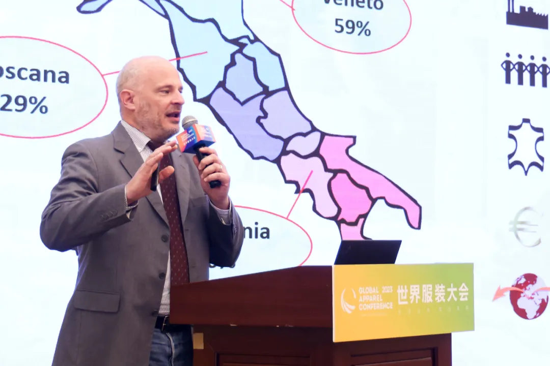 意大利琳瑯沛麗皮革協(xié)會CEO GIACOMO MARIA ZORZI作《服裝款式設(shè)計與面料的選擇匹配研究》報告。GIACOMO MARIA ZORZI簡要介紹了UNIC意大利制革行業(yè)貿(mào)易協(xié)會、ICEC皮革供應(yīng)鏈業(yè)務(wù)認(rèn)證機(jī)構(gòu)、LINEAPELLE展覽會,其中LINEAPELLE是國際重要的皮革、配件、組件、面料、合成材料、鞋類展覽會。他指出,世界主要時尚和設(shè)計品牌都了解意大利模式,并認(rèn)可其價值。他指出,風(fēng)格創(chuàng)新是服裝款式設(shè)計的第一要素,意大利體系的優(yōu)勢在于具有材料、技術(shù)和性能方面的創(chuàng)新能力,能確保客戶找到滿足風(fēng)格要求的高水平產(chǎn)品。另外,綠色轉(zhuǎn)型也是服裝產(chǎn)業(yè)必須考慮的問題之一,在意大利有些公司已經(jīng)能夠在染色階段將耗水量減少50%以上,有力促進(jìn)了意大利紡織服裝業(yè)的可持續(xù)發(fā)展。