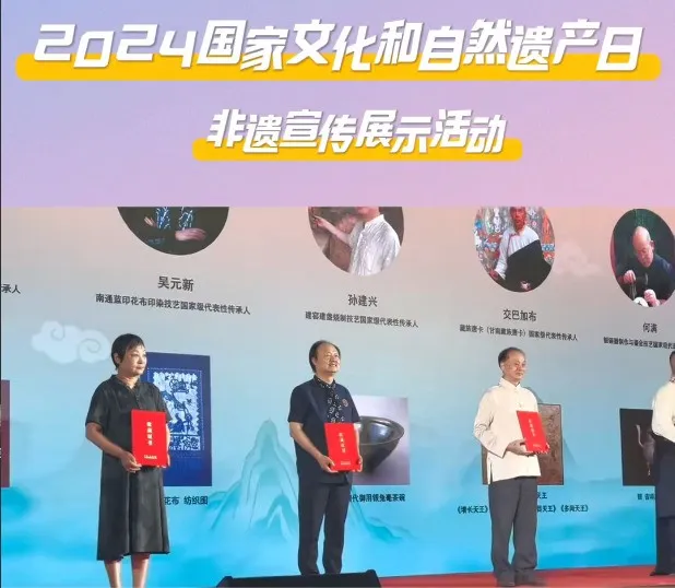 2024年6月7日,2024“文化和自然遺產(chǎn)日”非遺宣傳展示活動在中國非遺館舉辦,中國紡織非遺推廣大使、南通藍(lán)印花布國家級傳承人吳元新受邀參加并接受捐贈證書,去年他們將收藏的三百多件藍(lán)印花布作品捐給中國非遺館,為藍(lán)印花布的保護(hù)與傳承做出努力。