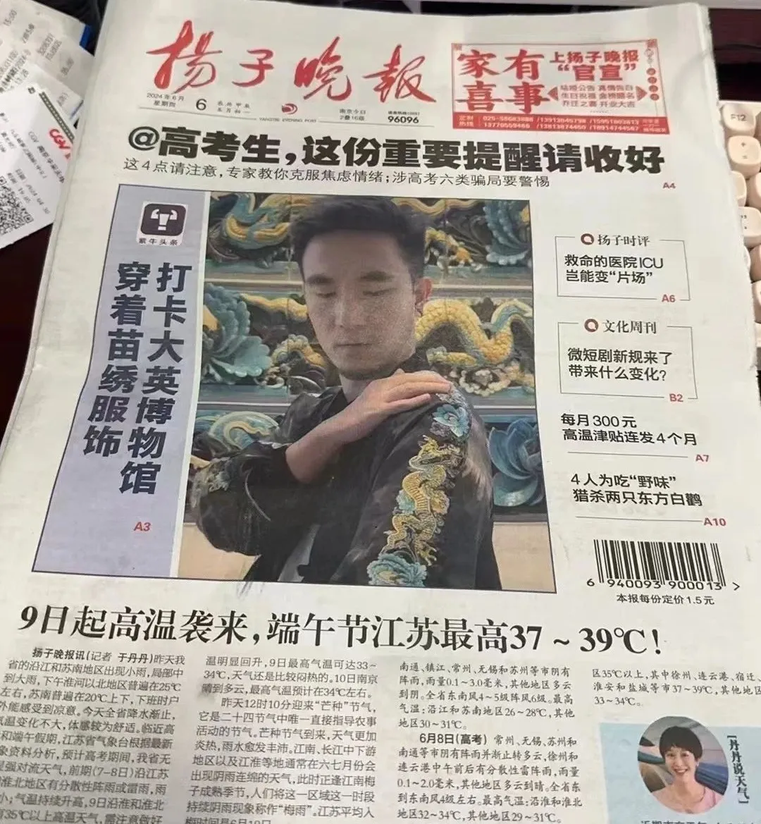 近日,中國紡織非遺苗繡推廣大使楊春林(阿新)帶著身為苗繡傳承人的媽媽打卡大英博物館。他穿上由自己設(shè)計(jì)、媽媽刺繡的帶有“明代琉璃龍紋”的服飾在真正的明代琉璃龍紋瓦文物面前打卡合影,讓網(wǎng)友們熱淚盈眶。阿新在貴州大山里長大,受到外婆和媽媽的影響,他從小喜愛服裝設(shè)計(jì),大學(xué)畢業(yè)后結(jié)合傳統(tǒng)民族元素創(chuàng)立了自己的服裝品牌。今年,他帶著媽媽去國外參加文化交流活動,他們穿著苗族傳統(tǒng)服飾打卡了比利時(shí)、德國、匈牙利、法國、英國等地的標(biāo)志性建筑,精湛的苗繡技藝驚艷外國朋友。