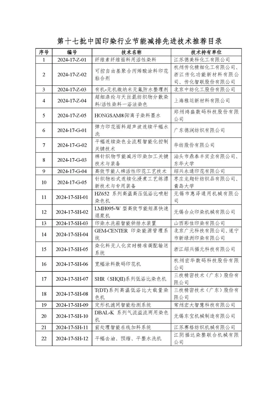 中國印染行業協會副秘書長劉添濤宣讀了《關于印發<第十七批中國印染行業節能減排先進技術推薦目錄>的通知》。此次共推薦節能減排先進技術43項(名單見附件)。