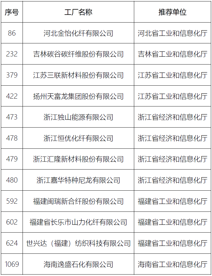 工信部按照《綠色工廠梯度培育及管理暫行辦法》(以下簡稱《管理辦法》)有關要求,經申報單位自愿申報、省級工業和信息化主管部門推薦及專家評審、公示等程序,確定了2024年度綠色制造名單。1月23日,工業和信息化部網站公布了 2024 年度綠色制造名單。在2024年度新培育出的 1382 家國家層面綠色工廠、123 家綠色工業園區以及 126 家綠色供應鏈管理企業中,有12家化纖相關企業入選綠色工廠名單。