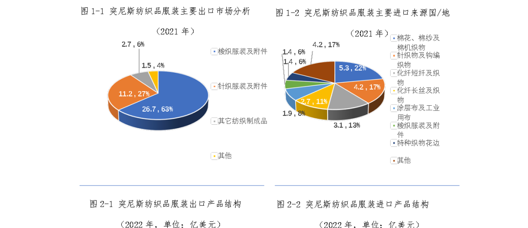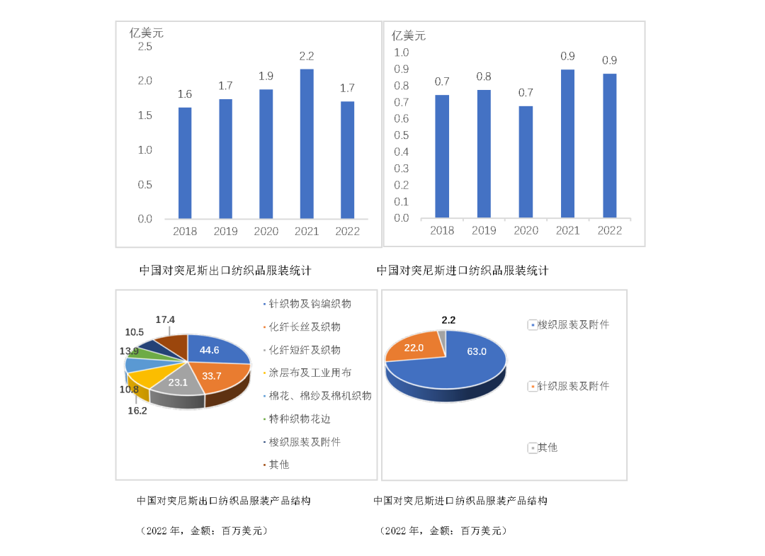 2022年,中國對突尼斯出口紡織品服裝1.7億美元,主要出口產(chǎn)品包括針織面料(占比26.2%)、化學(xué)纖維紗線及面料(化纖短纖及長絲紗線、織物合計占比33.3%)等。同期,中國自突尼斯進(jìn)口紡織品服裝8712萬美元,主要進(jìn)口產(chǎn)品為針?biāo)罂椃b及衣著附件,占比超過97.5%。