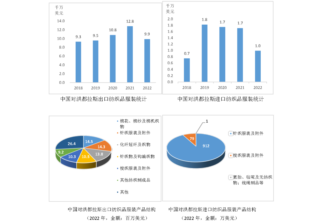 2023年,洪都拉斯和中國正式建立外交關系,成為中國第182個建交國。此前雖無外交關系,但兩國紡織行業仍有貿易往來。據中國海關統計,2022年中國與洪都拉斯紡織品服裝進出口總額為1.1億美元,其中出口額9883萬美元,進口額992萬美元。中國對洪都拉斯主要出口產品包括棉紗及棉機織物(占比14.6%)、針織服裝及附件(占比14.4%)、化纖短纖及織物(占比14%)、針織物及鉤編織物(占比10.6%)、梭織服裝及附件(占比10.4%)等;進口產品僅有針織服裝及附件(912萬美元,占比91.9%),梭織服裝及附件(79萬美元,占比8%),絮胎、氈呢及無紡織物、線繩制品等(1萬美元)。