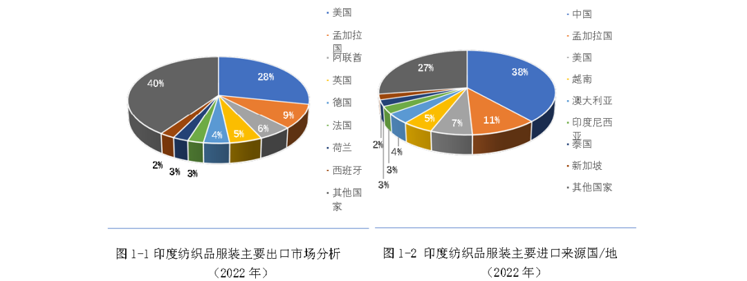 目前,印度是僅次于中國的世界第二大紡織品出口國和排位第七的服裝出口國。根據印度工貿部數據,2022年印度紡織品服裝出口額為384.4億美元,出口市場較為分散,主要包括美國(占比28%)、孟加拉國(占比9%)、阿聯酋(占比6%)及英國、德國等歐洲國家。從出口品類看,服裝是主要出口產品,占紡織品服裝出口總額的43.5%,針織服裝和梭織服裝出口比重相當,其次是棉花、棉紗及棉機織物(占比18.3%)。同期,紡織品服裝進口額為106.1億美元,中國是印度第一大進口來源地,占進口總額的38%,其次是孟加拉國(占比11%)、美國(占比7%)。主要進口產品為棉花、棉紗及棉機織物(占比16.3%),化纖長絲及織物(占比15.8%),化纖短纖及織物(占比11.7%),梭織服裝(占比8.5%)。