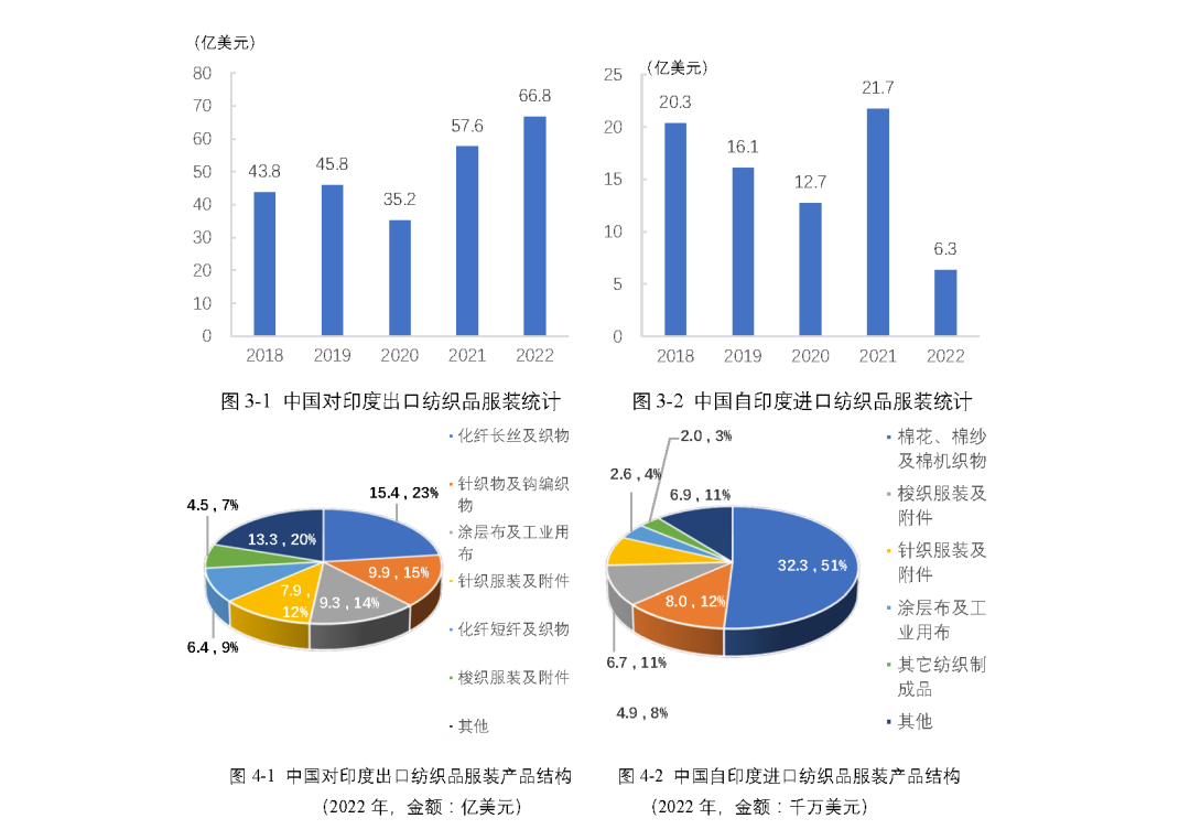 根據中國海關數據,2022年中國與印度紡織品服裝進出口總額為73.1億美元,其中中國對印度出口額為66.8億美元,自印度進口額為6.3億美元。中國對印度主要出口產品為化纖長絲及織物(占比23%)、針織物及鉤編織物(占比15%)、涂層布及工業用布(占比14%)、針織服裝(占比12%)等。中國自印度主要進口產品為棉花、棉紗及棉機織物(占比51%),梭織服裝(占比12%),針織服裝(占比11%),涂層布及工業用布(占比8%)等。