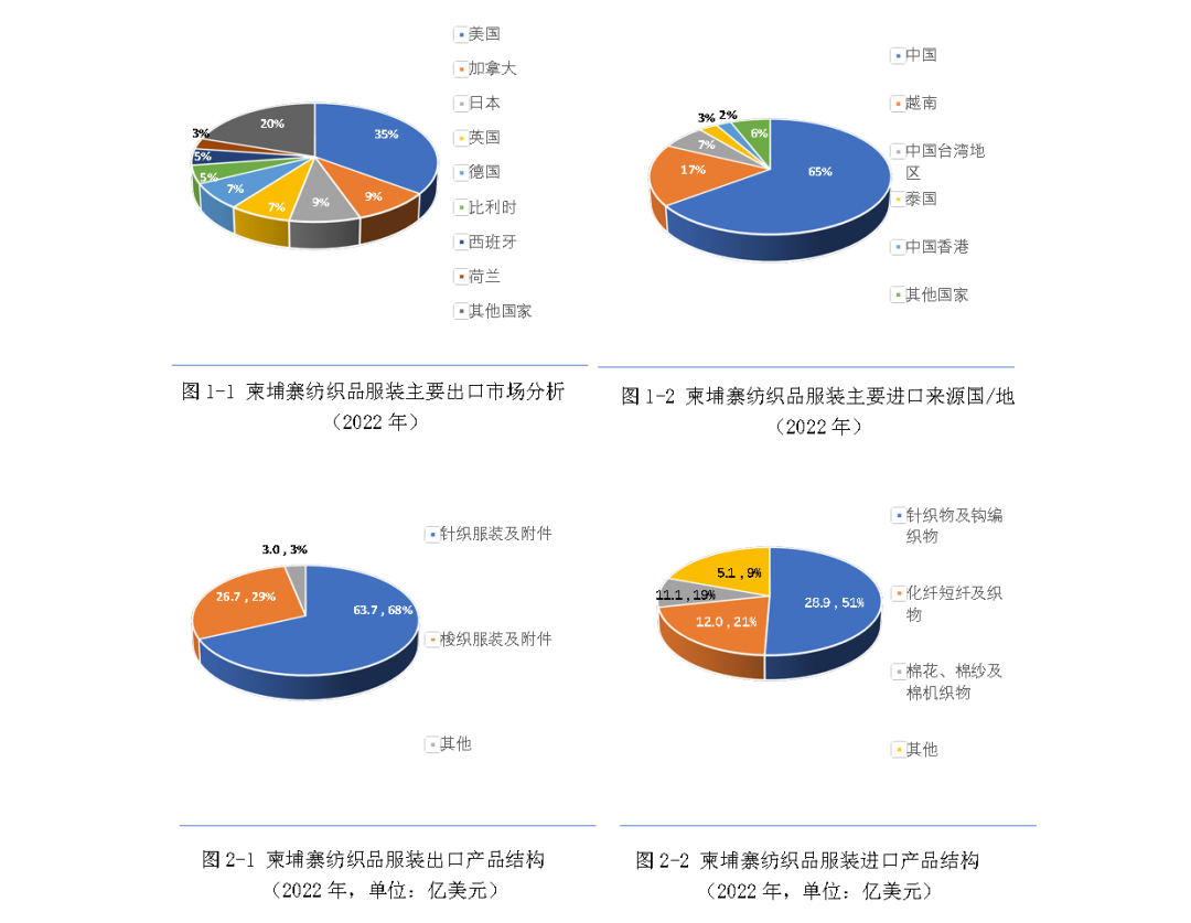 柬埔寨紡織品服裝貿易結構相對單一,出口以服裝為主,進口以面料為主。根據柬埔寨海關總署(General Department of Customs and Excise of Cambodia)數據,2022年,柬埔寨紡織品服裝出口額為93.4億美元,主要出口市場是美國、歐盟、加拿大、日本、英國,其中美國占出口總額的35.1%。從出口品類看,服裝是主要出口產品,占紡織品服裝出口總額的96.8%,其中針織服裝占比高達68.2%。同期,紡織品服裝進口額為57.1億美元,中國是柬埔寨第一大進口來源地,約占進口總額的65%,其次為越南、中國臺灣地區、泰國、中國香港等。主要進口產品為針織物及鉤編織物(占比51%),化纖短纖及織物(占比21%),棉紗及棉機織物(占比19%),服裝進口僅占2.6%。