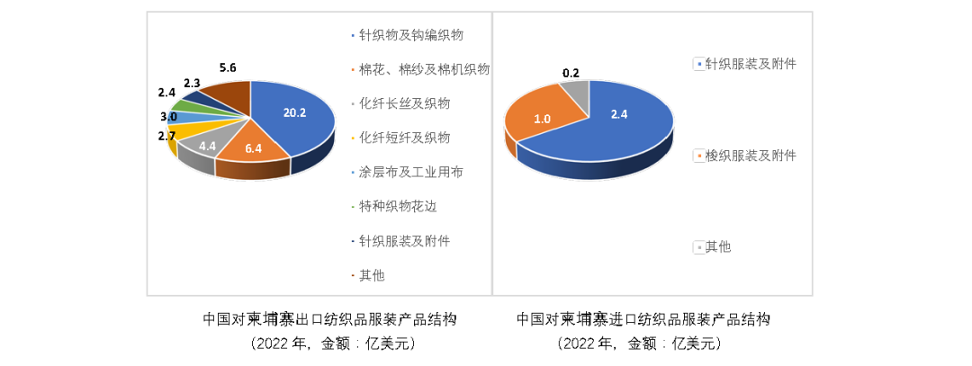 中國是柬埔寨第一大貿易伙伴國、投資來源國與國際援助來源國。2020年中柬自貿協定的簽署標志著雙方全面戰略合作伙伴關系、共建中柬命運共同體和“一帶一路”合作進入新時期,是雙邊經貿關系發展中的新里程碑。中國是柬埔寨紡織品服裝第一大進口來源國,據中國海關統計,2022年中國與柬埔寨紡織品服裝進出口總額達50.7億美元,其中出口額47億美元,進口額3.7億美元。中國紡織業對柬埔寨主要出口產品包括針織物及鉤編織物(占比42.8%),棉紗及棉機織物(占比13.6%),化學纖維及織物(占比15.8%)等。主要進口產品為各類服裝,占比高達93.5%。
