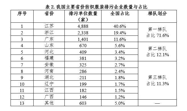 全國紡織服裝行業排污單位12,039家,其中紡織業10,284家,化纖制造業1,047家,紡織服裝、服飾業708家。在國民經濟行業分類基礎上,本文按照產業鏈環節對排污許可證所屬行業進行了重新分類,紡織:涉及棉、毛、麻、絲的初加工、紡紗、織造,化纖噴水織造的企業;專業染:專業從事印染單一產業環節的企業;紡織染:從事印染并且涉及紡紗、織造的企業;服裝服飾:服裝生產中涉及印染、洗水的企業;家紡:家紡產品生產中涉及印染的企業,與《國民經濟行業分類》(GB/T4754-2017)對應關系見表1。