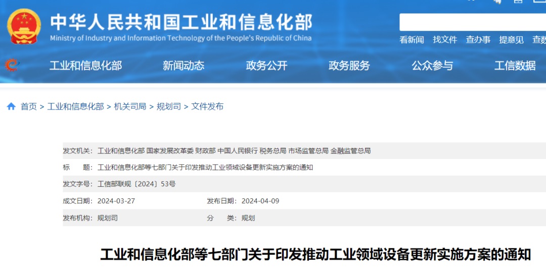 4月9日,工信部等七部門聯(lián)合印發(fā)《推動(dòng)工業(yè)領(lǐng)域設(shè)備更新實(shí)施方案》,提出圍繞推進(jìn)新型工業(yè)化,以大規(guī)模設(shè)備更新為抓手,實(shí)施制造業(yè)技術(shù)改造升級(jí)工程,以數(shù)字化轉(zhuǎn)型和綠色化升級(jí)為重點(diǎn),推動(dòng)制造業(yè)高端化、智能化、綠色化發(fā)展,為發(fā)展新質(zhì)生產(chǎn)力,提高國民經(jīng)濟(jì)循環(huán)質(zhì)量和水平提供有力支撐。