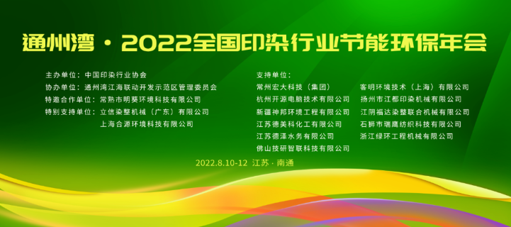 ?為加快綠色低碳技術(shù)的推廣應(yīng)用,推動印染行業(yè)全面綠色轉(zhuǎn)型,實(shí)現(xiàn)高質(zhì)量發(fā)展和高水平保護(hù),8月11日,由中國印染行業(yè)協(xié)會主辦、通州灣江海聯(lián)動開發(fā)示范區(qū)管理委員會協(xié)辦的“通州灣?2022全國印染行業(yè)節(jié)能環(huán)保年會”在江蘇省南通市隆重舉行。