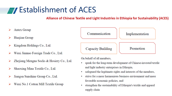 “中國(埃塞)紡織輕工企業(yè)可持續(xù)發(fā)展聯(lián)盟”會員和宗旨 會議還討論了項目后期進一步提升埃塞俄比亞紡織業(yè)可持續(xù)發(fā)展能力的計劃,并提出了明確的工作構(gòu)想與實施路徑。