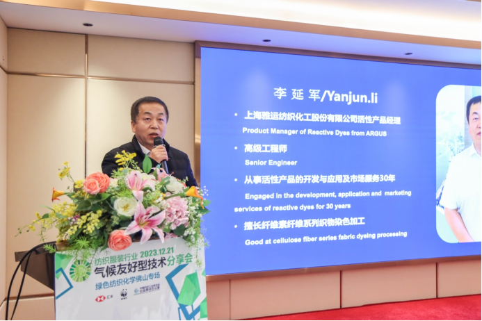 陳利敏會(huì)長接著發(fā)表致辭,他強(qiáng)調(diào)了佛山紡織服裝業(yè)在快速發(fā)展中形成的產(chǎn)業(yè)集群特征。同時(shí)提到在“碳達(dá)峰”、“碳中和”目標(biāo)下,印染行業(yè)面臨的挑戰(zhàn)和轉(zhuǎn)型的重要性。佛山作為紡織行業(yè)應(yīng)對(duì)氣候變化的先行者,擁有良好的創(chuàng)新環(huán)境和政策支持。他期望通過這次分享會(huì)探索紡織印染行業(yè)的綠色低碳發(fā)展新路徑,并致力于將南海區(qū)打造成綠色發(fā)展的新樣板。