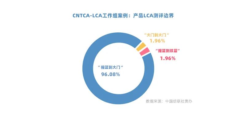 根據CNTAC-LCA工作組統計,目前絕大部分(96.08%)產品的測評邊界為“搖籃到大門(Cradle-to-Gate)”,對于紡織品即從“纖維到成品”,1.96%的產品測評邊界為“搖籃到墳墓(Cradle-to-Grave)”,1.96%的產品測評邊界為“大門到大門(Gate-to-Gate)”。