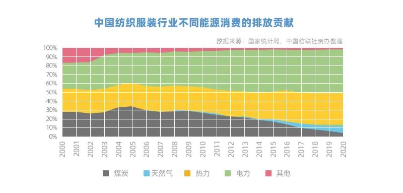 從能源結構來看,中國紡織服裝行業不斷優化能源結構,推進行業能源使用的低碳轉型。中國紡織服裝行業排放絕大部分來自能源使用(主要是電力和蒸汽),到2020年,“煤改氣”“煤改電”取得顯著進展,行業煤炭消耗占比從30%顯著下降至低于10%,電氣化程度不斷提高。
