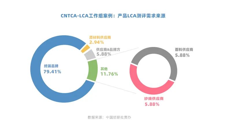 CNTAC-LCA工作組案例顯示,終端品牌是產品碳足跡測評的主要推動者。79.41%的測評需求來源于品牌,2.94%來源于原材料供應商,11.76%來源于紗線、面料等中間產品供應商,還有剩余5.88%的測評由供應商和品牌方合作發起。