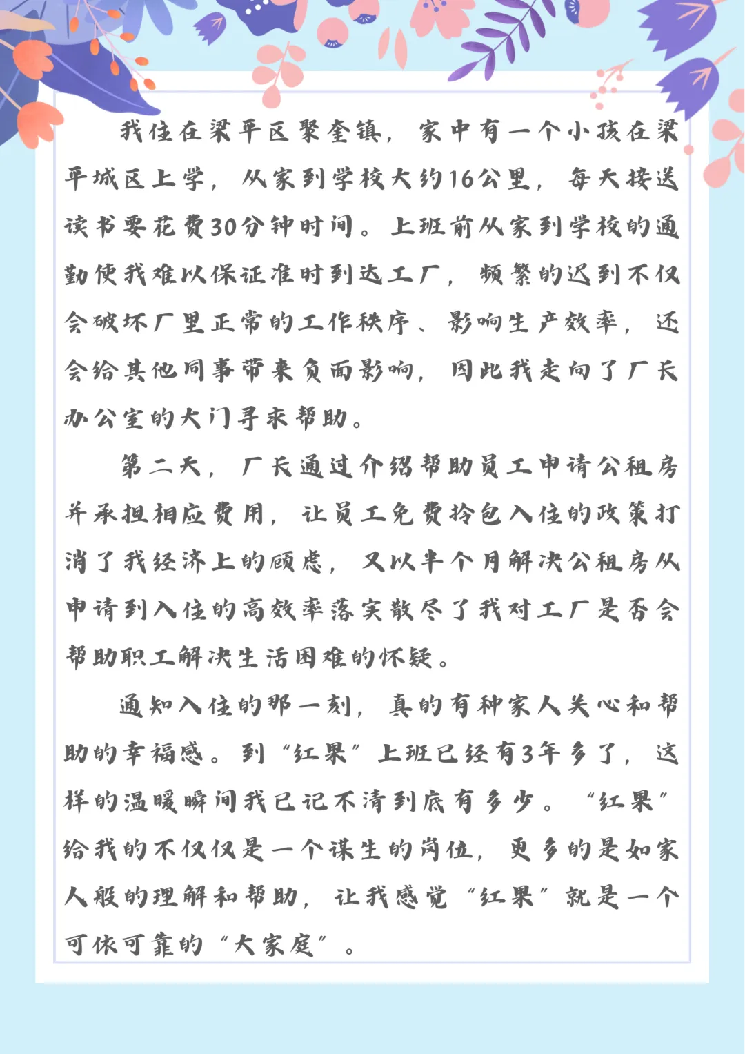 員工對工廠的信任來源于紅果對員工的關愛,也讓所有紅果員工切身感受到工廠關懷。