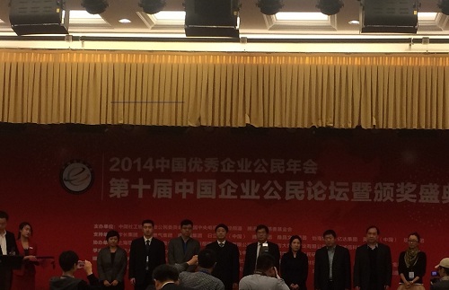 2014年11月22日,由中國社工協(xié)會企業(yè)公民委員會、中央電視臺財經(jīng)頻道和騰訊公益慈善基金會共同主辦的“2014第十屆中國優(yōu)秀企業(yè)公民年會暨頒獎盛典”在京舉行,本屆年會的主題是“新常態(tài)、新責任、新