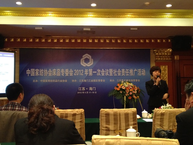 中國(guó)家紡協(xié)會(huì)床上用品專業(yè)委員會(huì)2012年第一次會(huì)議于4月17-18日在江蘇海門光華國(guó)際大酒店隆重召開。作為會(huì)議重要內(nèi)容之一,18日下午特別舉辦了家紡企業(yè)社會(huì)責(zé)任培訓(xùn)講座,有近60名全國(guó)家紡行業(yè)企業(yè)負(fù)責(zé)人參加