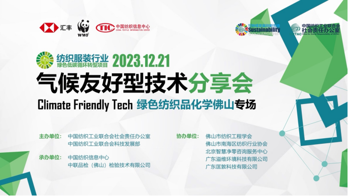 2023年12月21日,由中國紡織工業聯合會社會責任辦公室、中國紡織工業聯合會科技發展部聯合主辦的氣候友好型技術分享會-綠色紡織化學品專場在佛山西樵成功舉辦。